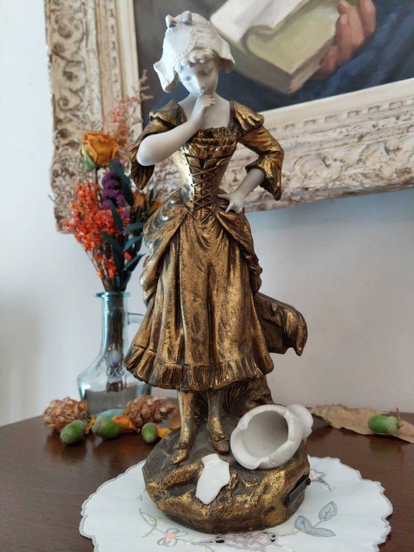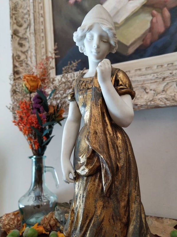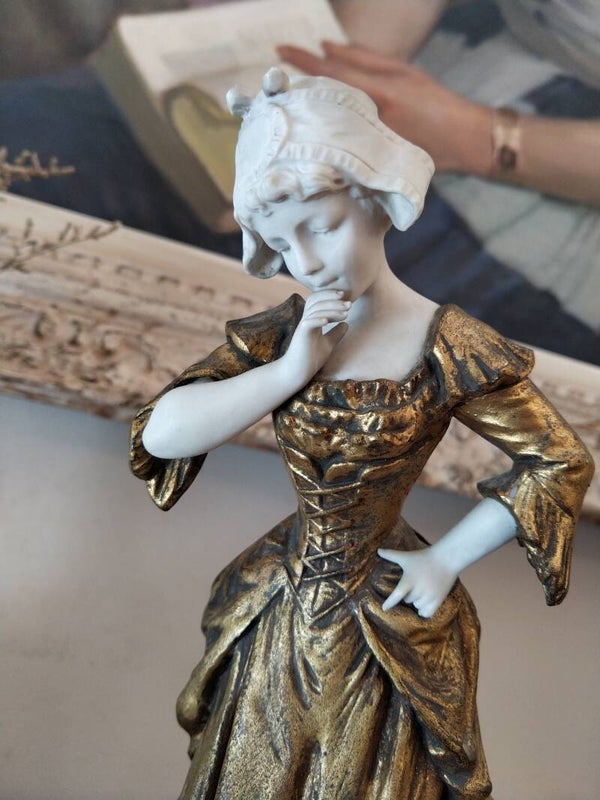 Exceptionnelle et rare paire de statues en porcelaine biscuit et métal doré, époque Art Nouveau 1900, elles pourraient être appelées "Oups !!", elles portent le cachet du fabricant à Paris au dos, elles sont signées par le sculpteur Médnot.