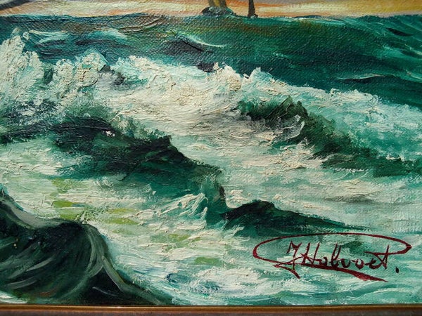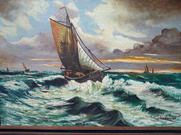 Peinture à l'huile sur toile signée J.HOBOOET (?), peintre hollandais, milieu 20éme, oeuvre d'art bien encadrée, tableau représentant une courses de bateaux dans la tempête.