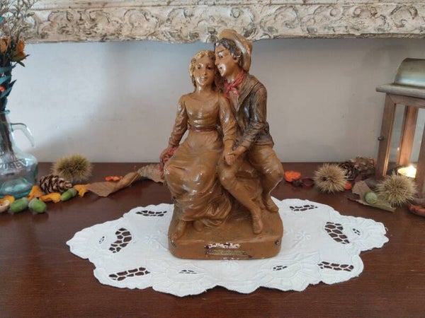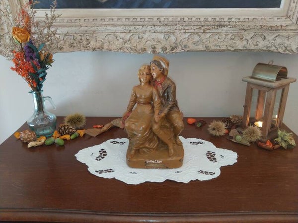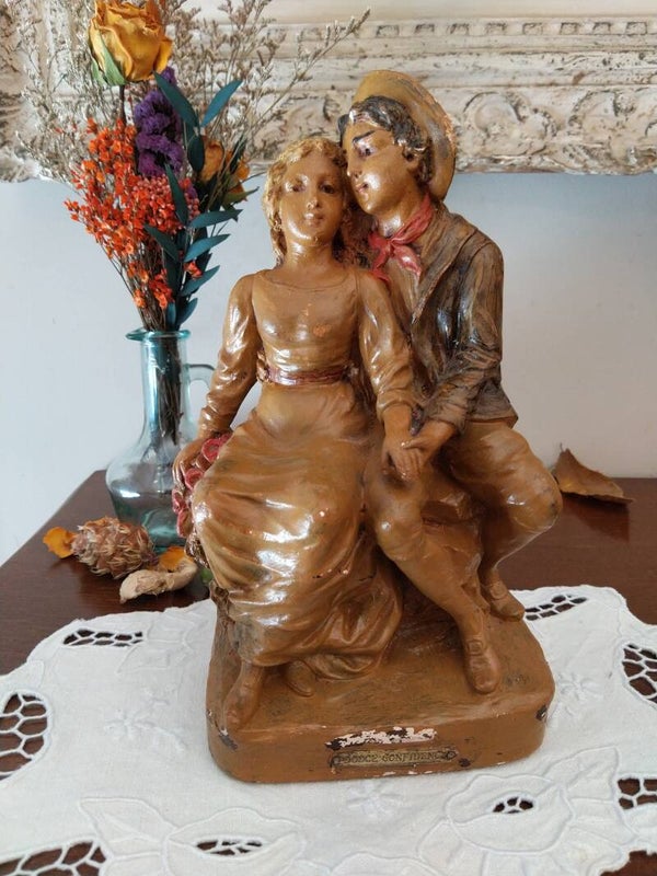 Sculpture en plâtre des années 1920/1930 représentant un jeune couple d'amoureux et titrée sur la base "Douce confidence", statue ancienne de fabrication Française numérotée.