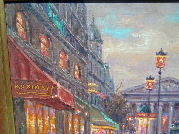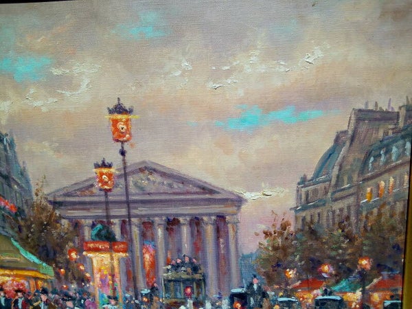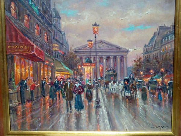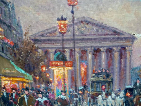 Superbe peinture à l'huile sur toile signée par le célèbre peintre des vues parisiennes André BOYER (1909-1981), très belle oeuvre d'art représentant la Place de la Madeleine à Paris.