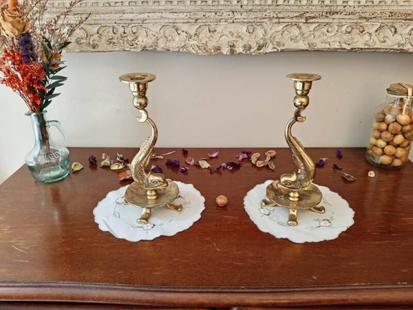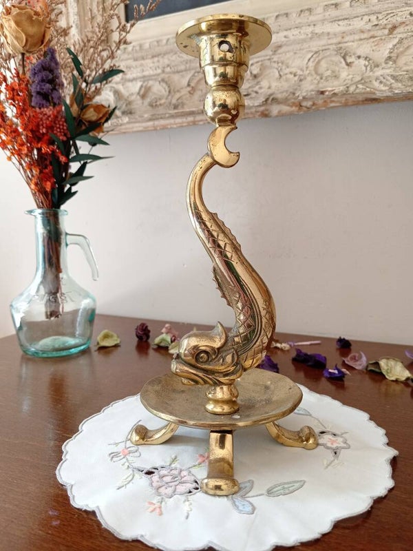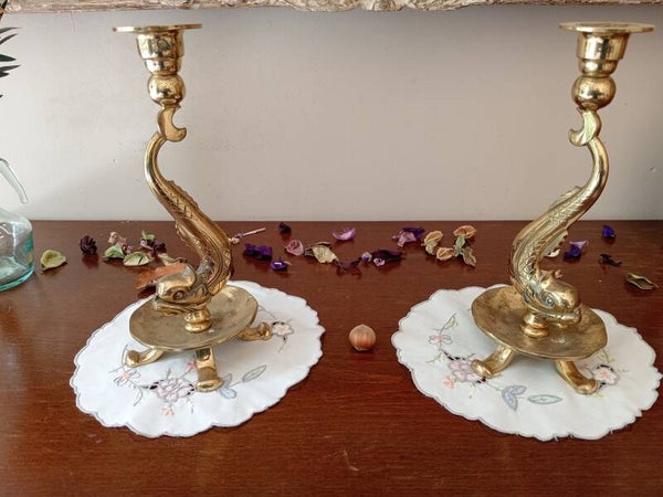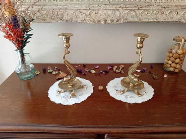 Superbe paire de bougeoir en bronze doré et ciselé à corps de dauphins, années 1960