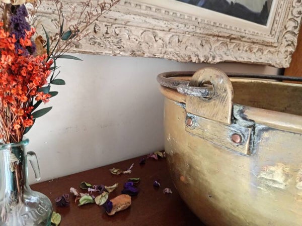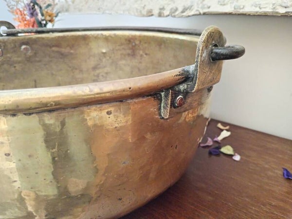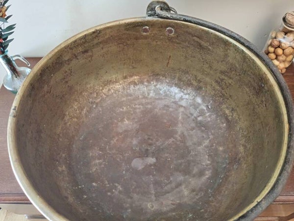 Grand chaudron en cuivre jaune ancien 3.6 kg, anse en fer forgé
