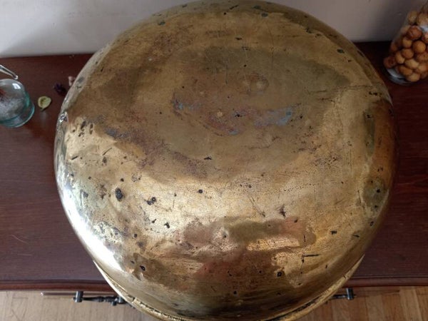 Très grand chaudron ancien en cuivre jaune, objet ancien de fabrication artisanale française.