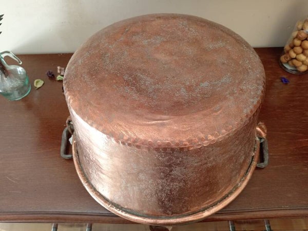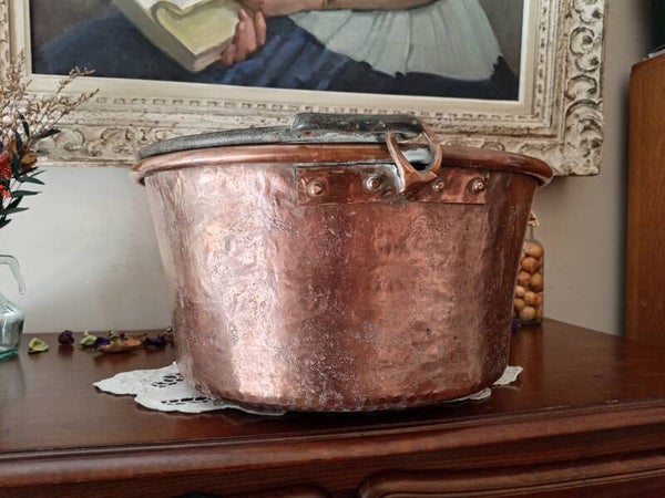 Grand chaudron en cuivre ancien 3.5 kg fabriqué à la main, anse en fer forgé