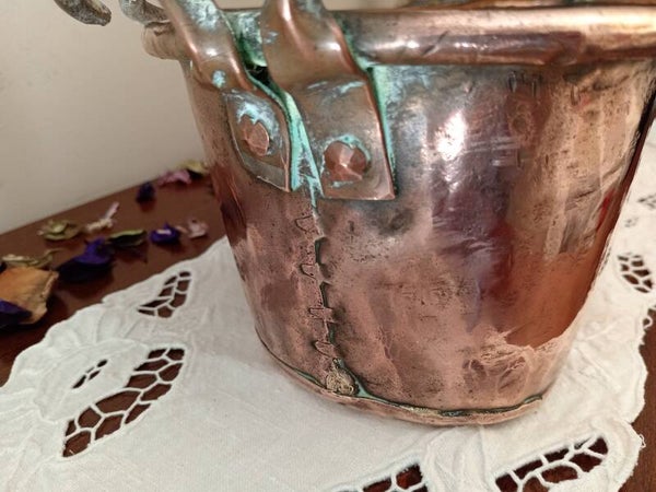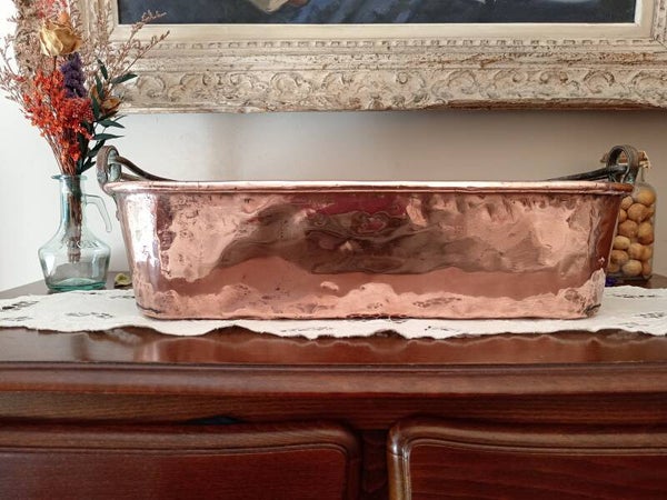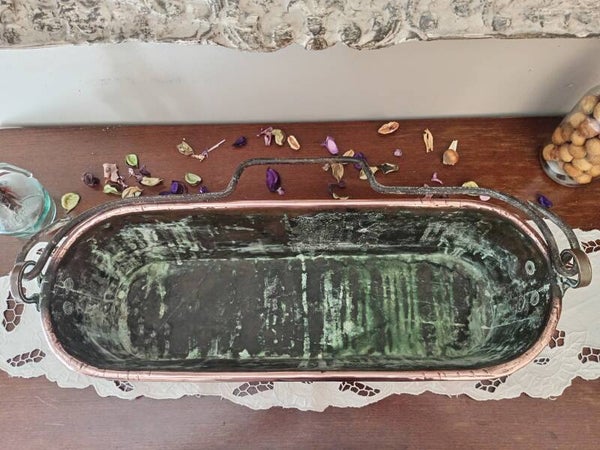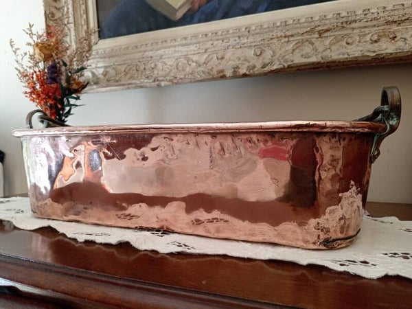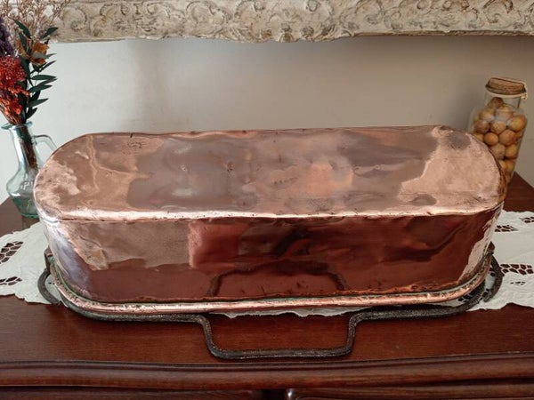 Grande poissonnière ancienne en cuivre massif, anse en fer forgée, 19éme siècle, entièrement faite à la main, également appelée saumonière ou bouilloire à poisson, peut servir comme jardinière ou élément de décoration.