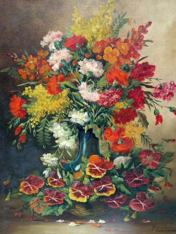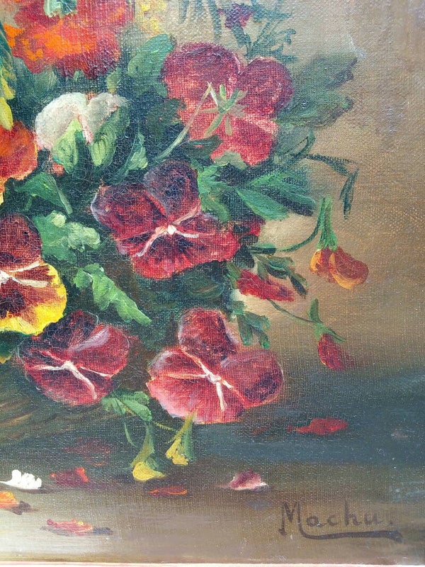 Ancienne peinture à l'huile sur toile, signée MACHU, 19ème siècle, authentique oeuvre d'art représentant un bouquets de fleurs dans un vase, joli cadre doré récent de style ancien en très bon état.