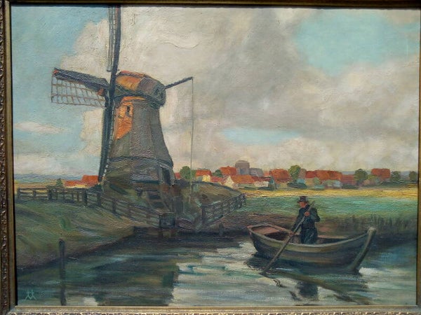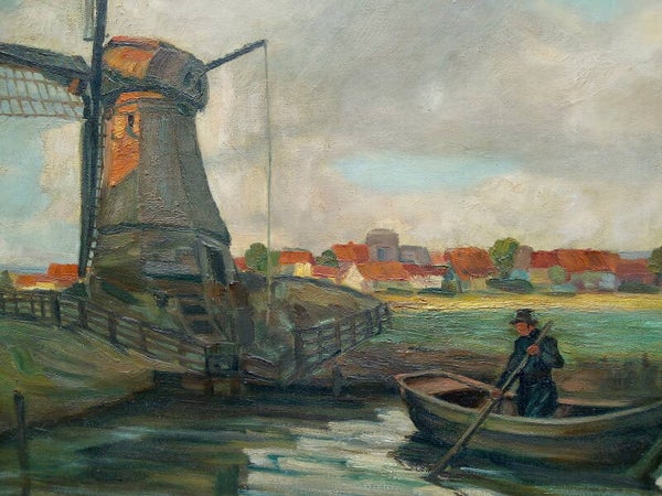 Très belle oeuvre d'art authentique pour cet artiste à identifier. Les nuages dans le ciel, ses reflets sur l'eau ainsi que la lumière ambiante du coucher de soleil sur le sommet du moulin sont traités de manière très talentueuse, nous donnant la sensation d’entendre le clapotis de la barque sur l'eau et le vent brassé par les palles du moulin.