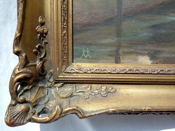 Peinture à l'huile sur toile monogrammée, somptueux cadre doré d'époque en parfait état, CIRCA 1920.