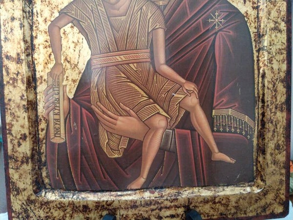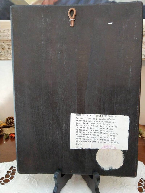 Grande icône byzantine sur feuille d'or faite à la main (sujet non peint) sur un véritable panneau de bois incurvé très épais.