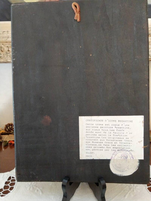 Exceptionnelle icône byzantine sur feuille d'or faite à la main (sujet non peint) sur un véritable panneau de bois incurvé très épais.