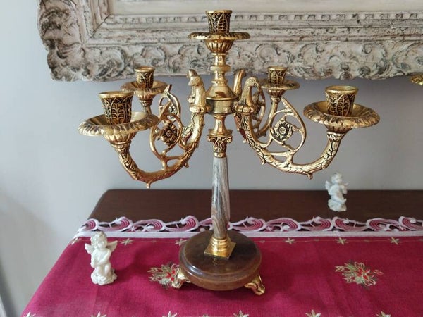 Rare et splendide paire de candélabres à 4 branches en bronze doré et onyx, de style Restauration, milieu 20éme siècle, à décor de têtes d'oiseaux.