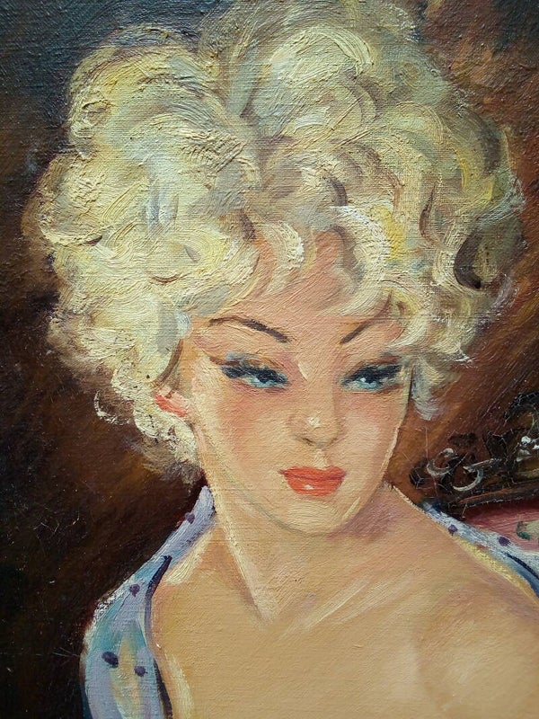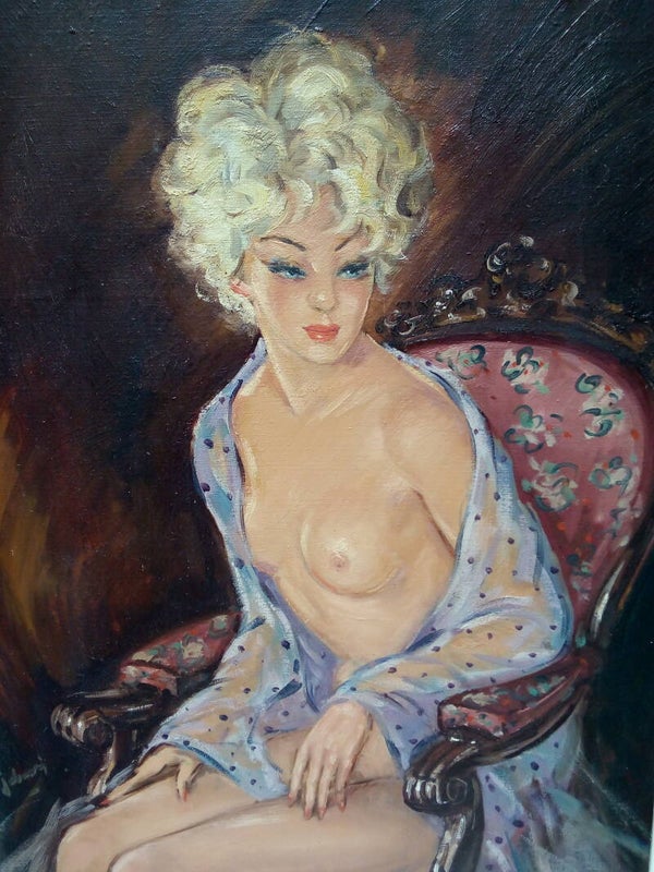 Exceptionnelle peinture à l'huile sur toile dans le goût de Jean-Gabriel DOMERGUE, Nu assis, CIRCA 1960, signature à déchiffrer, annotée au dos "TERRY HENRI Simon(n)e, il devait s'agir d'une commande du portrait en buste de cette jeune femme qui devait se nommer ainsi où alors il s'agit du portrait d'une certaine Simone commandée par Terry HENRI...